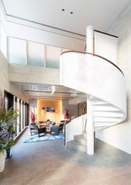 2層吹抜けのエントランスホールが心地よい開放感を演出。象徴的なモチーフとして螺旋階段を配置。